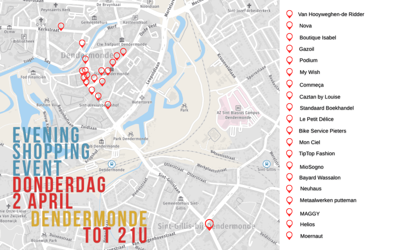 Voor het eerst organiseren we met Dynamisch Dendermonde i.s.m. het stadsbestuur van Dendermonde een Evening Shopping Event op 2 april. Op deze dag zijn de winkels open tot 21u.